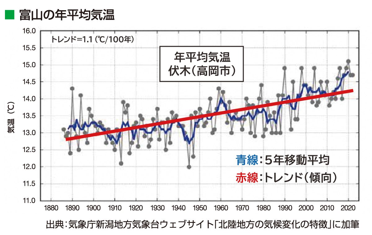 富山県の平均気温は過去100年で1.1℃上がっています。最高気温が35℃以上の「猛暑日」や、最低気温が25℃以上の「熱帯夜」も増えていて、2023年は、猛暑日が30日、熱帯夜が37日と過去最多でした。このまま十分な対策をとらなければ、2030年代には、富山県の気温は今より1~2℃上がる可能性があると言われています。