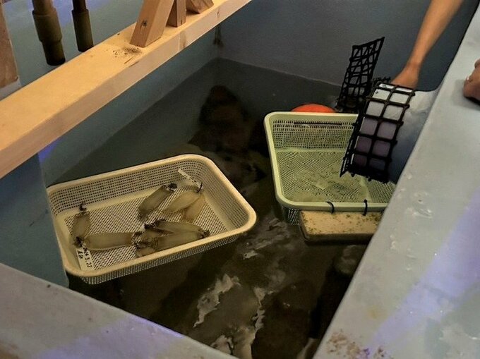 大水槽の裏側にも案内してもらい、餌やりをしたり、バックヤードにある水槽などを見せてもらったりしました。
