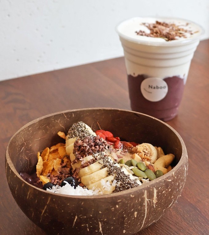「アサイーボウル」(1,320円、手前)は数量限定。「Nabooのアサイースムージー」(990円)はアサイーとバナナの2層の味わいが楽しめる