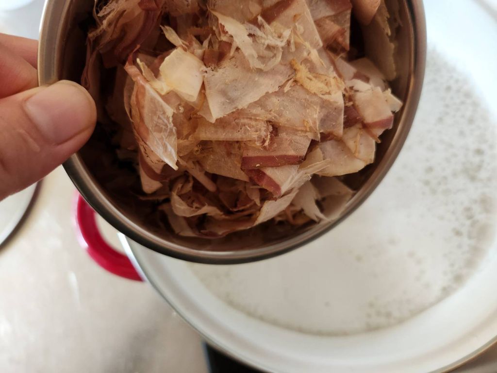 ② 出汁を取る。鍋を火にかけ、沸騰する前に昆布を引き上げる。鰹節を入れて沸騰させ4~5分煮出してから濾す。