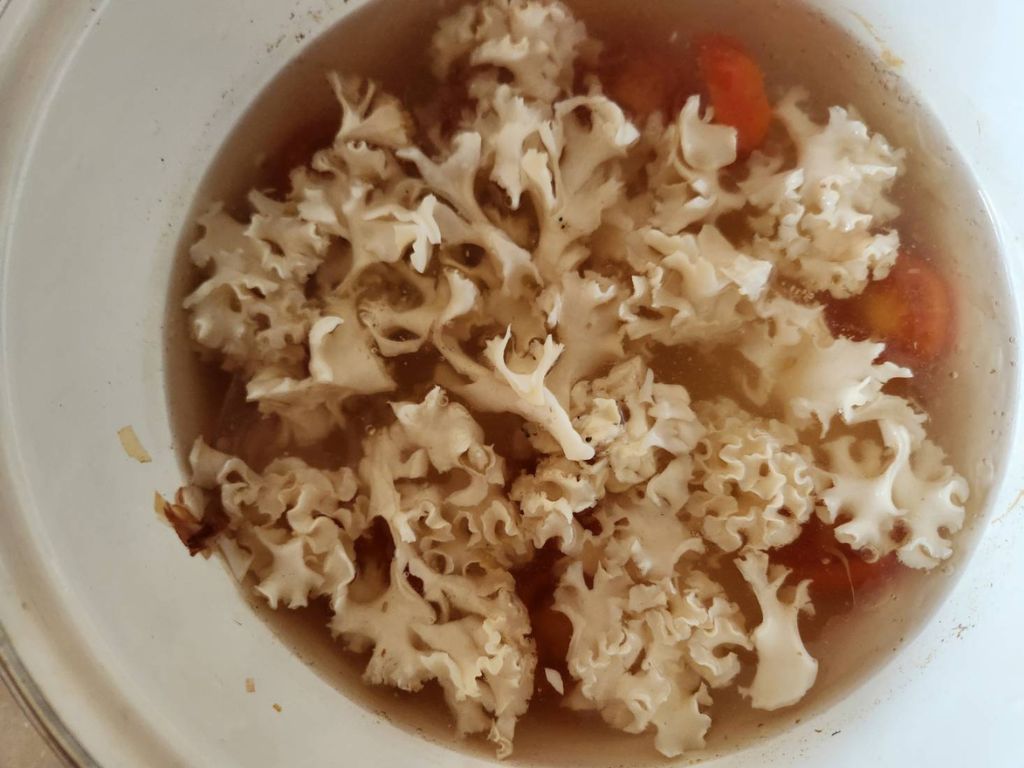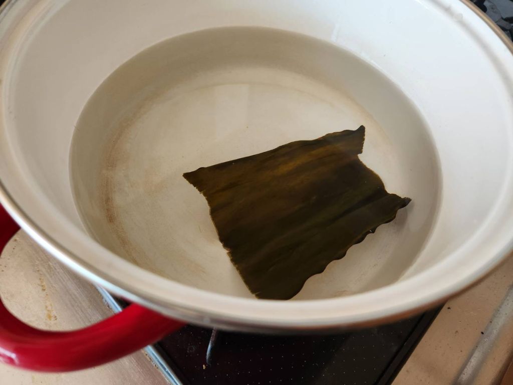 ① ハナビラタケを日光浴させる。乾燥わかめを水で戻しておく。鍋に水と昆布を入れ、30分以上置いておく。