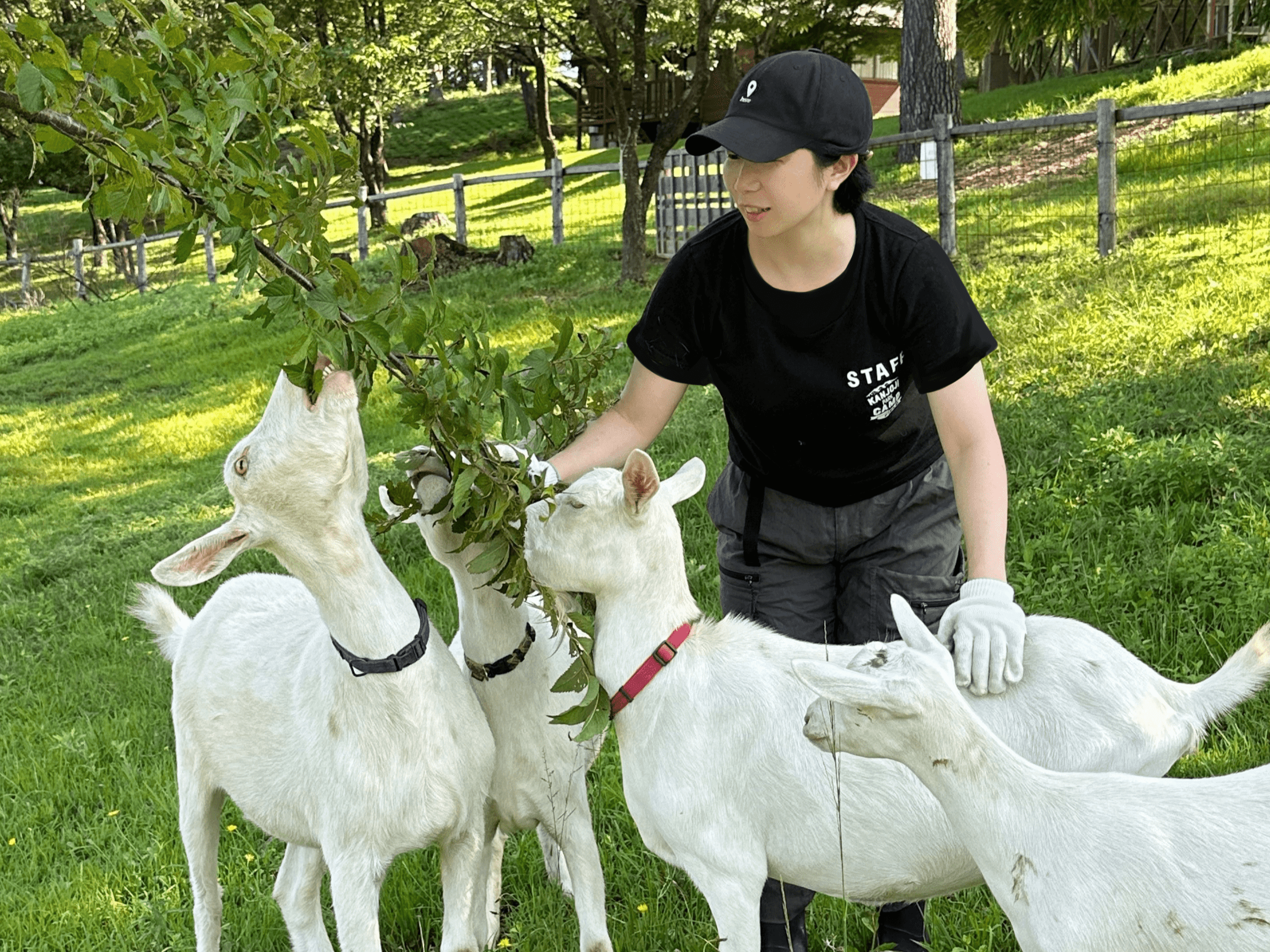 2022年6月からはヤギの飼育も始まり、現在はカンタロウ・ジョーイ・テラミス・ベスの4頭を世話しています。幼い頃から動物が大好きで、以前は動物園の飼育員としてハムスターからライオンまで幅広い種類の動物と触れ合う仕事をしていました。その経験も生かせていると感じています。