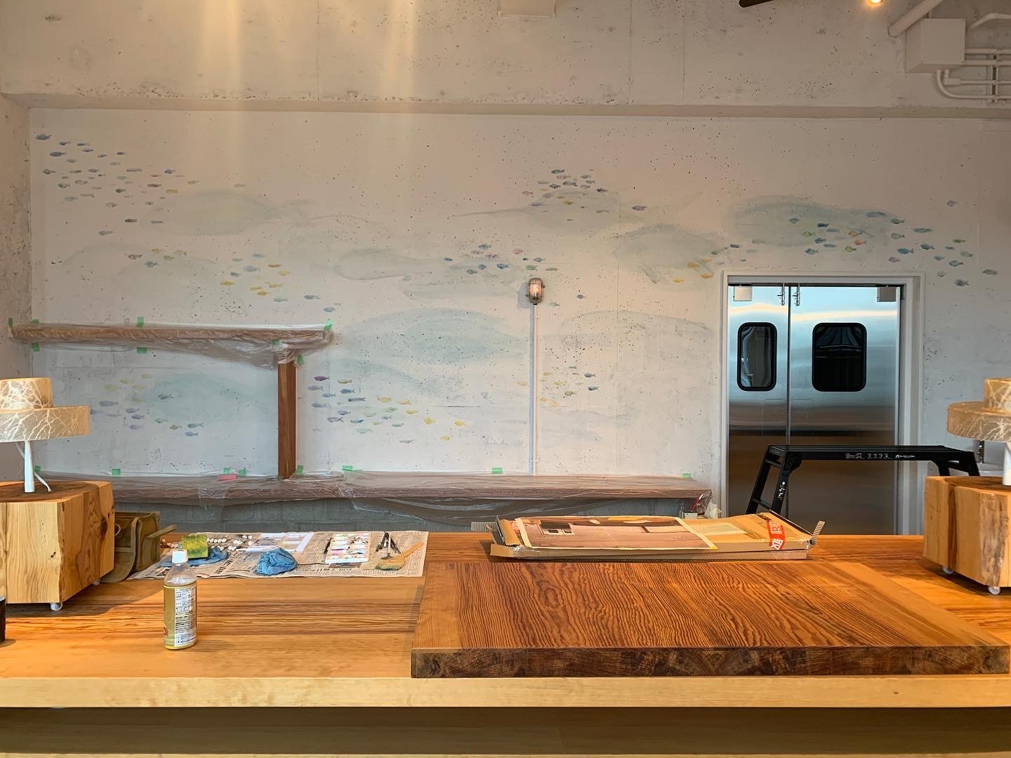 「minato kitchen」の作品は、最初は力強いイメージで制作を進めていました。でも実際に現場を見てみると、窓からキラキラと差し込む光の効果で壁が水槽のように見えたんです。それで絵本のような幻想的な雰囲気が合うと感じ、海の中にいるような気分になれる柔らかな雰囲気に仕上げました。普段はデジタルでの制作が多いですが、現場で絵の具を使っての制作は一発勝負の楽しさがあり、やり直しが効かない分思いがけない良い色味が生まれることもあって、リアルな場ならではの作品づくりの魅力を感じましたね。