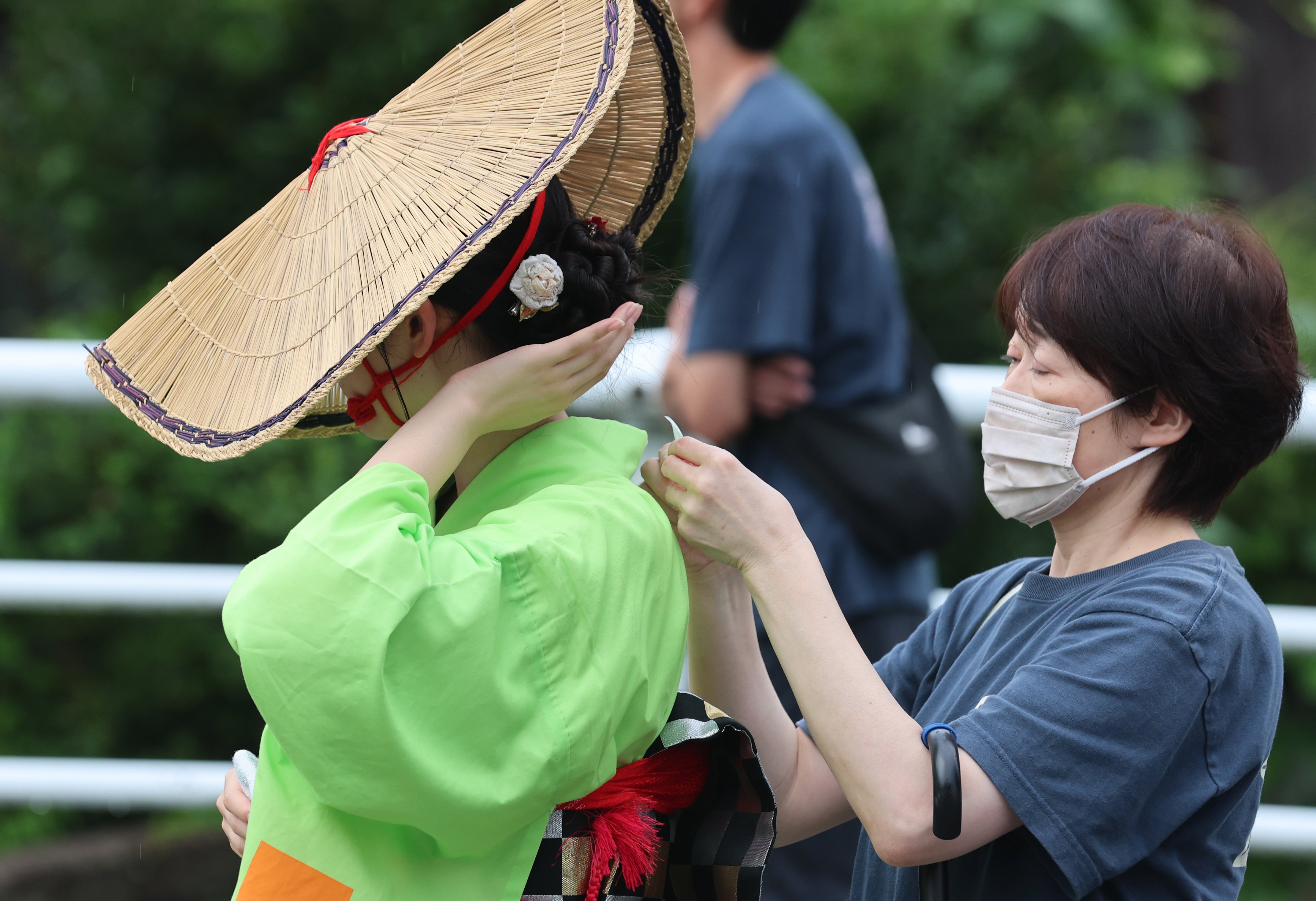 踊り手の結った髪を直す女性=2日午後5時25分ごろ、東町