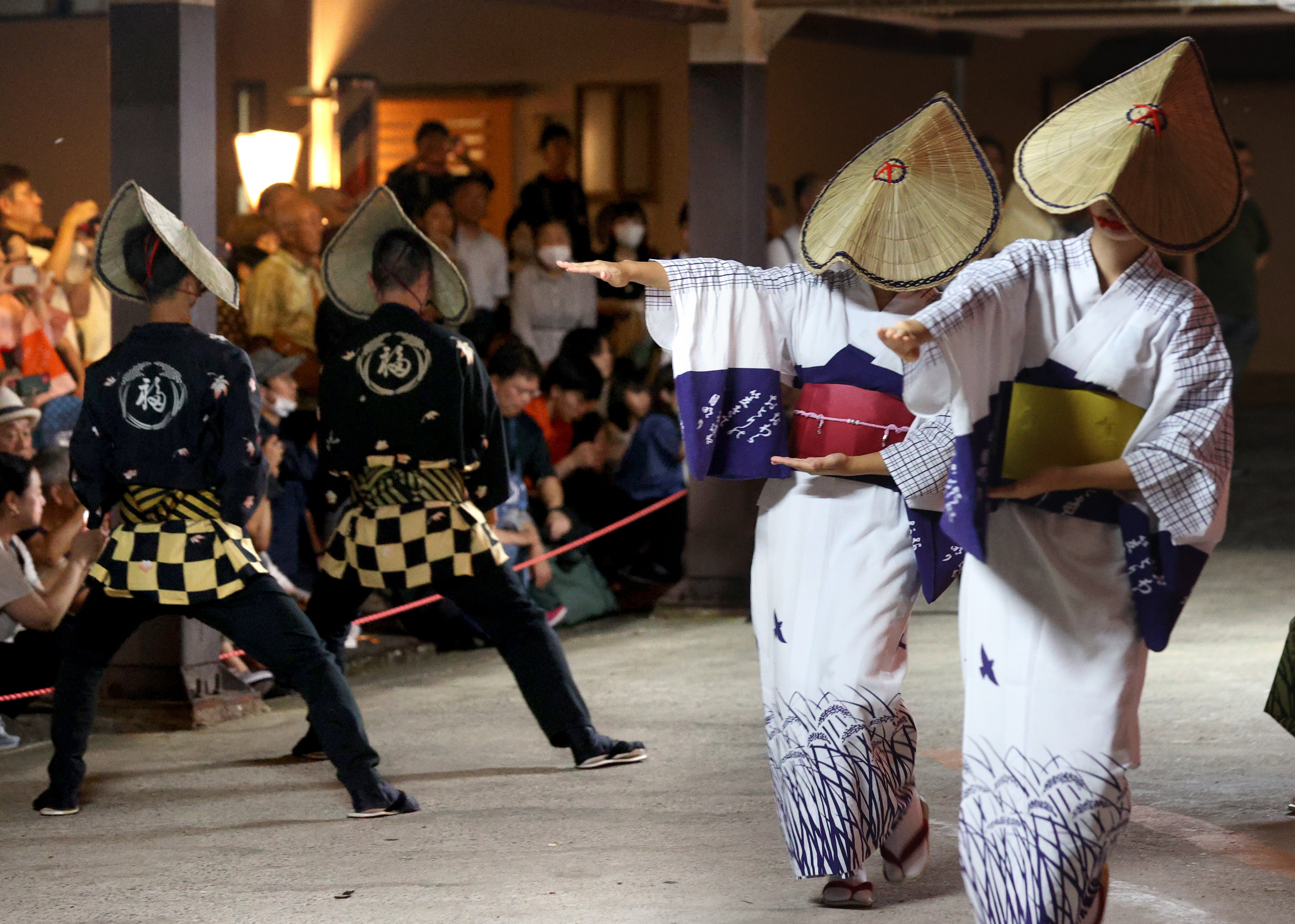 しばらくすると、女踊りから男踊りに切り替わり、見物客の視線は男性の方に向いた。女性たちは舞台脇にはける際、客席からは後ろ姿しか見えなくなっても踊り続けた。おわらの担い手という“プロ意識”を感じた。