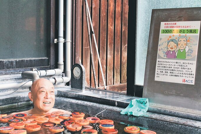 16日の「敬老の日」にちなみ、「100のありがとう風呂」と題して男女それぞれのイベント湯で開催。園児や入浴客が円形の入浴木に「ありがとう」の言葉や絵などを自由に書き入れ、50個ずつ浮かべた。