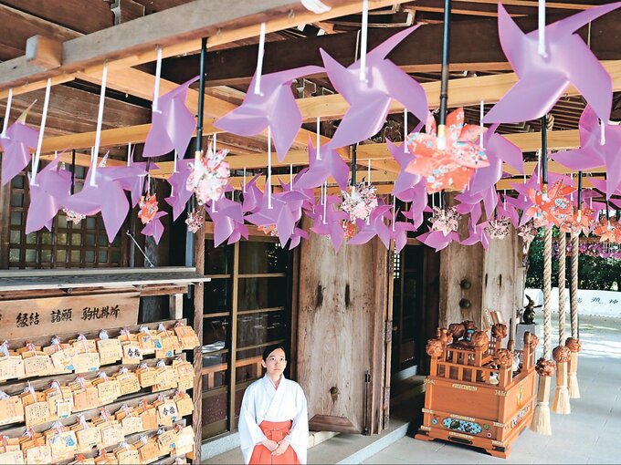 風が吹くと、カラカラと音が鳴り、厳しい残暑が続く中、参拝者に涼を届けている。参集殿(さんしゅうでん)のテラスには月とウサギを表現した折り紙120個を飾っている。