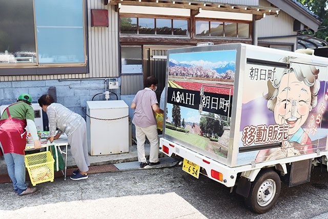 移動販売車を運営しているのは、朝日町シルバー人材センター。2013年に町の委託事業として始まった。保冷車と軽ライトバンの2台で週3回、スーパーが近くにないケアハウスや山間部の過疎地域を回る。