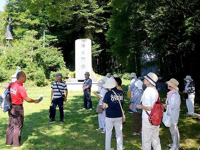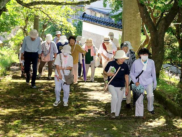 会員約30人が市民体育館を発着点に、城山公園内にある神武天皇の銅像や消防神社を通る約3・5キロを歩いた。市政出前講座も兼ねて行い、市職員らから各スポットの歴史などを聞いた。