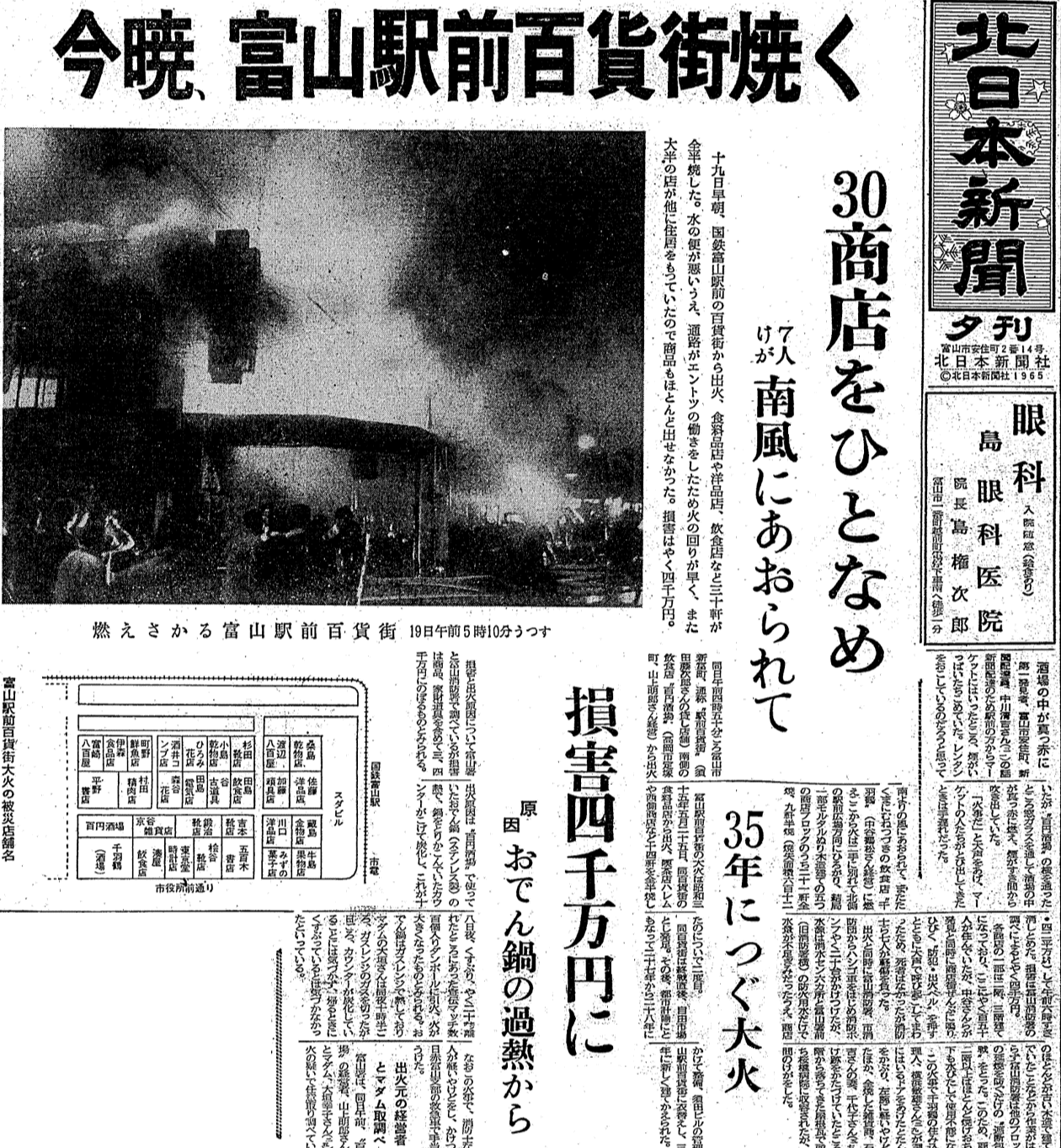 富山駅前の百貨街にある酒場から出火。通路やアーケードが煙突の役目を果たし、食料店や洋品店、飲食店など31店舗が全半焼した。1960年にも大火があり、建設省から防災街区に指定され、鉄筋コンクリートビル建設計画が検討されていた矢先だった。
