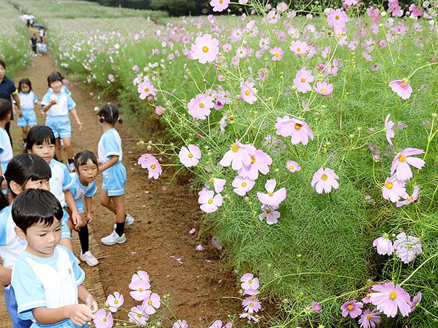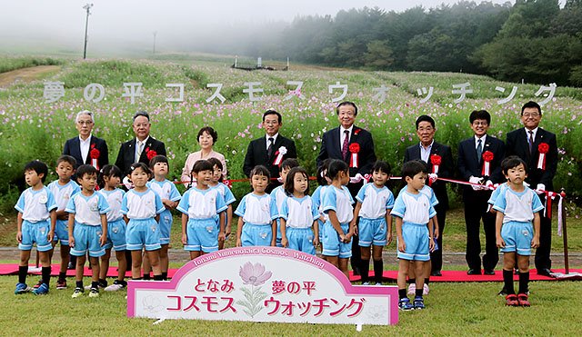 開会式で前田会長があいさつ。夏野修市長、山田順子市議会議長が祝辞を述べ、テープカットした。しょうがわ認定こども園の園児による歌の披露もあった。この日はあいにくの雨となったが、コスモス畑を見て回った園児たちは「きれいだった」と笑顔を見せた。