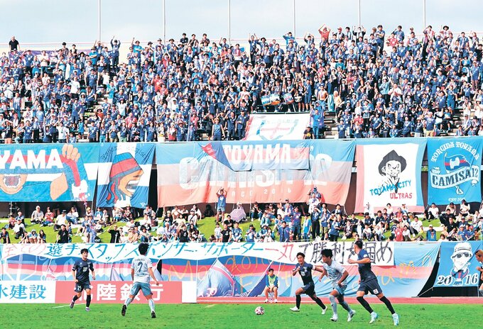 サッカー明治安田J3第31節は6日、各地で6試合を行い、3位のカターレ富山は県総合運動公園陸上競技場で2位今治と0-0で引き分けた。勝てばJ2自動昇格圏内の2位に浮上できたが、順位の入れ替えはならなかった。会場には2015年のJ3降格後最多となる9700人が駆け付け、熱い声援を送った。