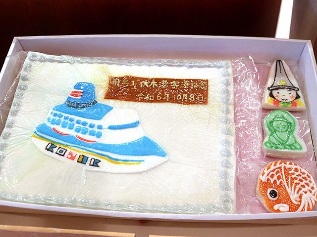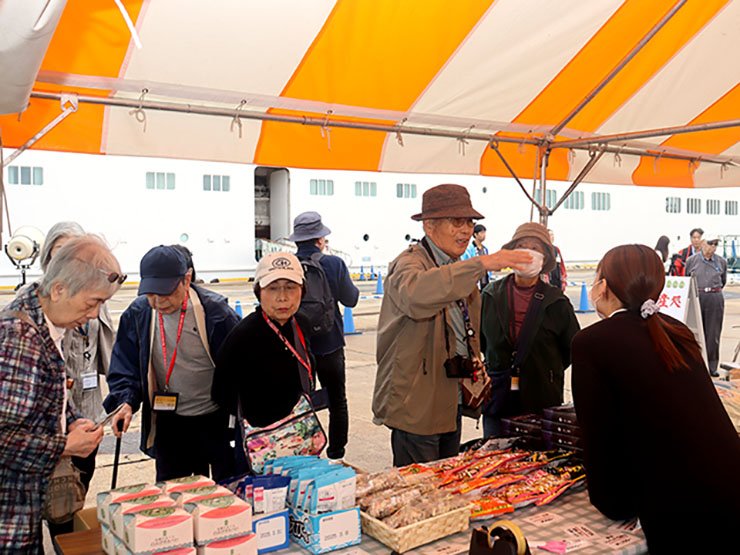 船内では歓迎セレモニーが開かれ、河村幹治副市長が渡辺恒介船長に客船をモチーフにした細工かまぼこを贈った。乗船客は同市の国宝瑞龍寺や南砺市の世界遺産・五箇山合掌造り集落などの観光を楽しんだ。