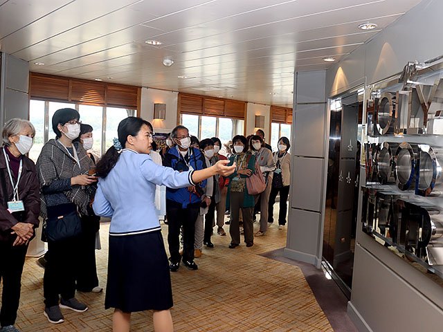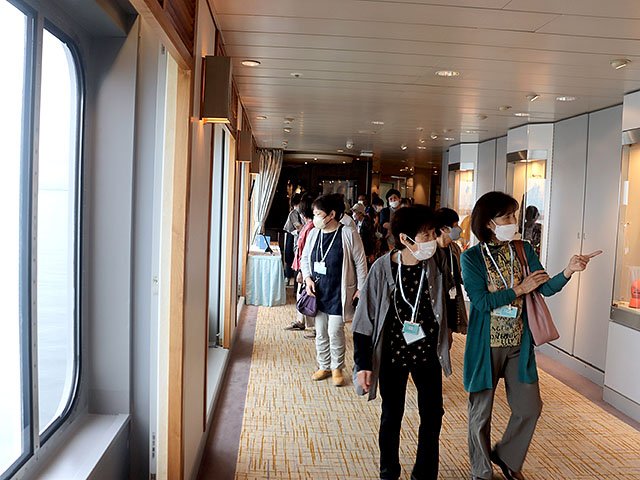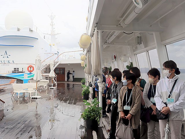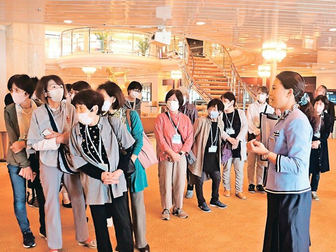 見学会では、事前申し込みがあった参加者が乗務員の説明を聞きながら船内のラウンジや映画館、デッキなどを興味津々な様子で見て回った。市内から参加した横田美和子さん(77)は「ゆったりとした雰囲気がすてきで憧れた。船旅をしてみたい」と話した。