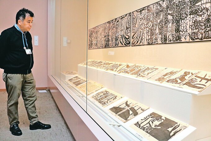 富山県南砺市福光地域ゆかりの板画家、棟方志功が凶作に苦しむ東北地方の救済を祈り制作した「東北経鬼門譜(とうほくきょうきもんふ)」(1937年)の板画120枚が、同市福光美術館の常設展で紹介されている。表装する前の状態で、6曲1双屏風(びょうぶ)に仕立てると縦1・2メートル、幅10メートルとなり、棟方が戦前に手がけた作品では最大となる。表装前の板画が展示されるのは珍しく、同館は「最初で最後の機会になるかもしれない。ぜひ多くの人に見に来てほしい」と話す。