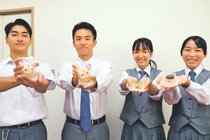 富山商業高校の3年生は、ボン・リブラン(富山市)が製造する富山銘菓「甘金丹」とのコラボ商品を作ったほか、餅店「源七」(魚津市)と協力して串に刺さないで食べる団子を開発した。9日に同校で発表会を開き、出席した生徒14人が一般販売に向けて新商品の魅力をPRした。