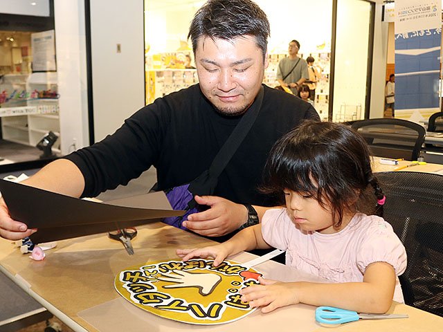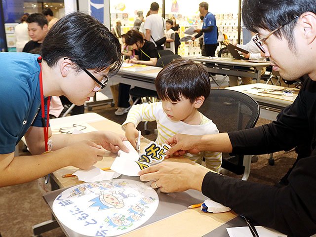 11月3日に開かれる「富山マラソン2024」に向けた応援用うちわ作りのワークショップ(WS)が12日、小矢部市の三井アウトレットパーク北陸小矢部であり、来店客がランナーへのエールを込めた一枚を仕上げた。