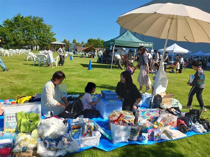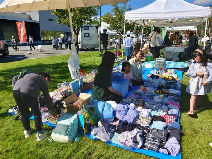 フリーマーケットは幅広いラインアップで、子ども用の絵本や衣服、おもちゃなどがそろいました。お買い得な商品を探し求め、家族連れがお気に入りの品を見定めていました。