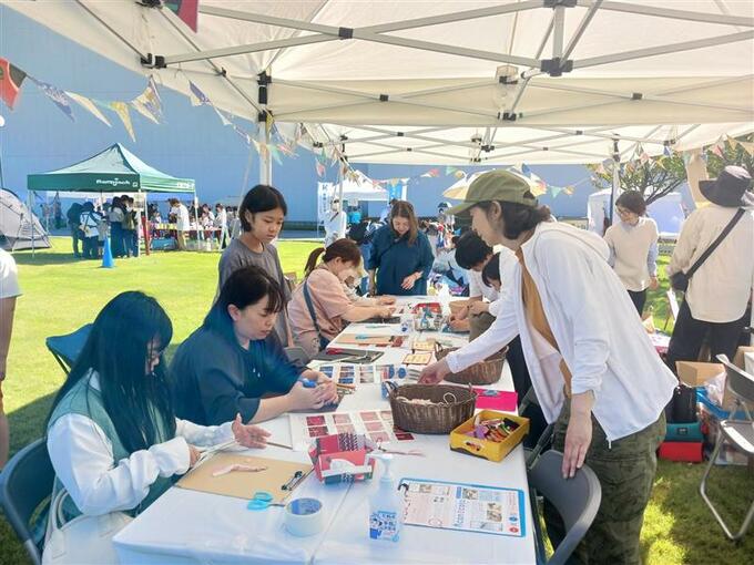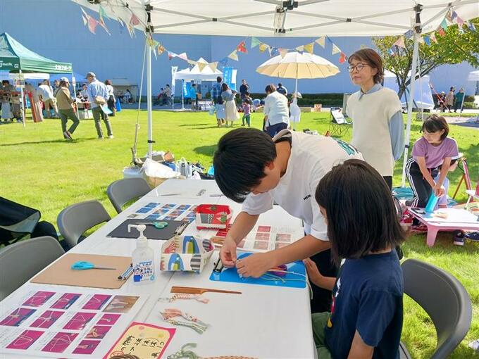 10時のオープンから、続々と来場者が訪れます。マクラメ編みキーホルダーのワークショップでは、この日のために編み方を練習してきた子どもたちが〝先生役〟として大活躍! 丁寧に手ほどきしていました。