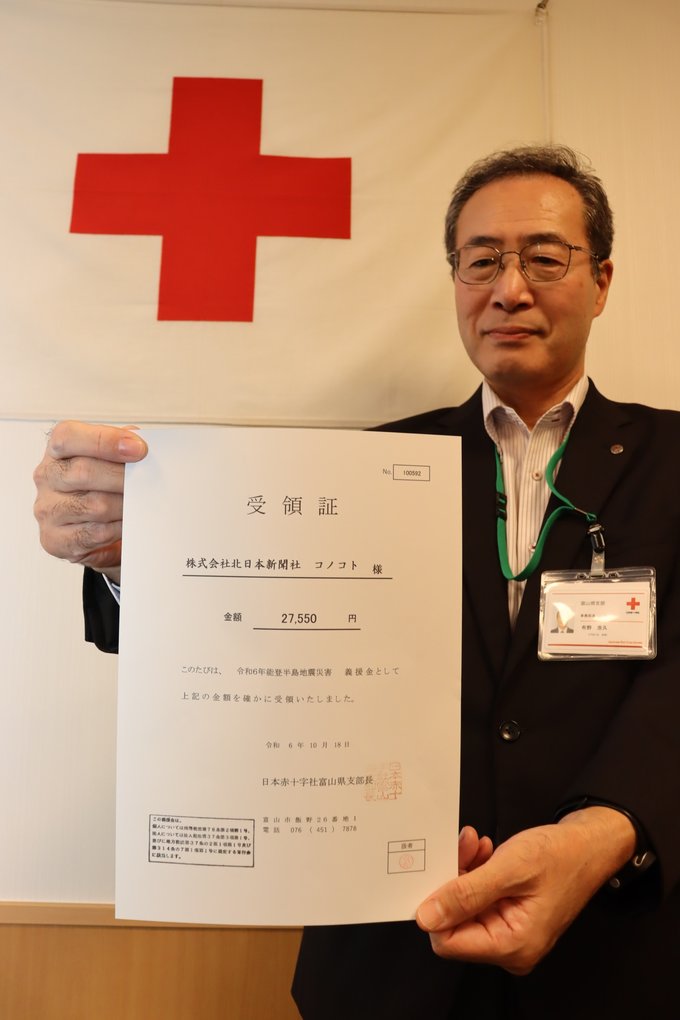 売り上げの一部2万7550円は能登半島地震の義援金として日赤県支部に寄付しました。被災地の復興に役立ててもらいます。