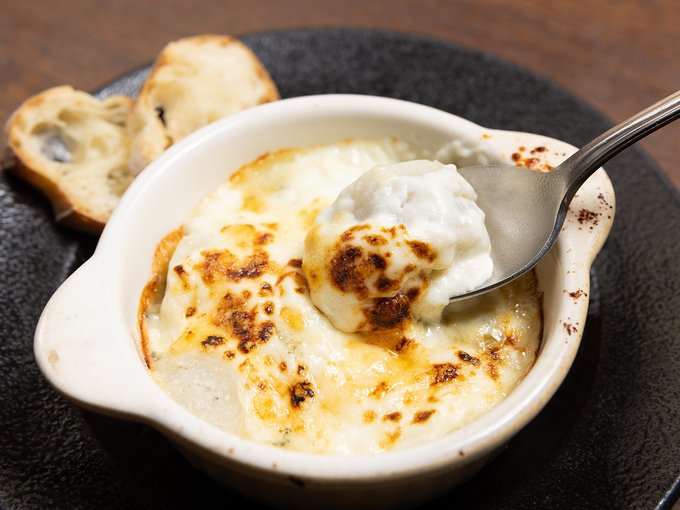 悟道さんが「初めて食べた時にあまりのおいしさに感動した」という稲葉農園(上市町)のさといもを使ったグラタンもおすすめ。とろりと溶けたチーズにさといもの粘りが絡み、互いの味を引き立たせている。