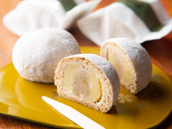 蜜漬けにしたつるぎさといもと黄みあんを香ばしい生地で包んだ。さといもはマロングラッセと同じ製法でしっとりした食感に