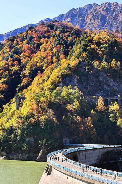 立山黒部アルペンルートの黒部ダム周辺(標高1470メートル)の紅葉が見頃を迎えている。21日は雲一つない青空が広がり、大勢の観光客がダム湖に迫る赤や黄に色づいた山肌に見とれていた。富山地方気象台によると、県内の朝の最低気温は富山8・5度、高岡(伏木)9・0度などとなり、全10観測地点で今季一番の冷え込みを記録した。