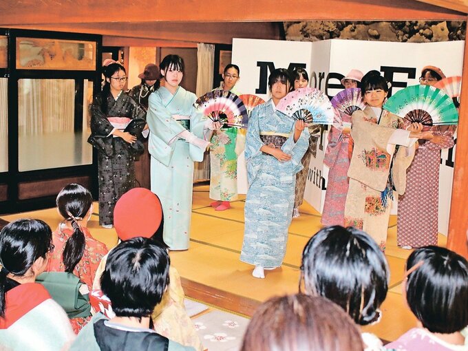 富山県上市町の有志でつくる「かみいち子どもの感性を育む会 きらきらのたね」(酒井千紗代表)と、上市中学校地域協働活動サークル「ひーろーかんぱにぃ」によるイベントが20日、同町大岩の大岩山日石寺で開かれ、約40人が自由に楽しむ着物文化の魅力に触れた。
