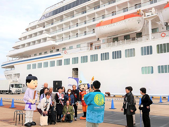 国内最大級のクルーズ客船「飛鳥II」(全長241メートル、5万444トン)が22日、富山県高岡市の伏木富山港に寄港し、乗船客約650人が県内外の観光地を巡った。