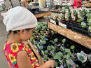 お母さんが買い物のついでにスーパーでごみの分別をしています。車を使わずに歩いて行くようにしています。