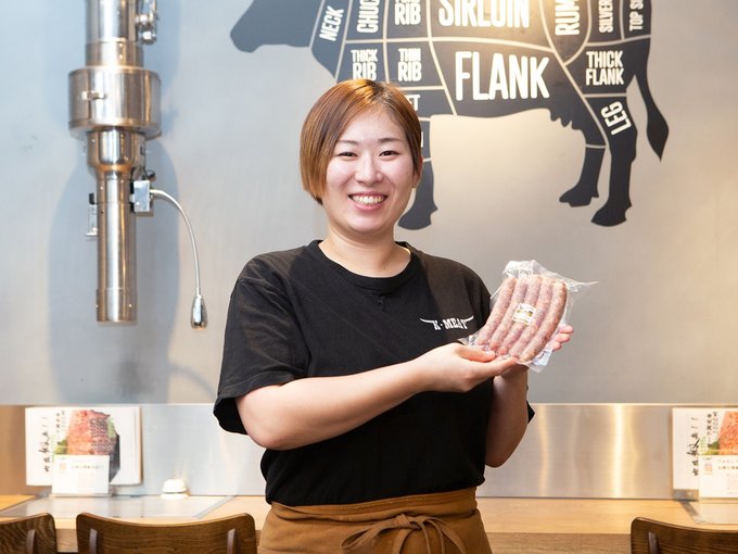 イノシシ肉のウインナー(5本1,250円)を持つ営業兼店舗管理の大杉穂乃佳さん
