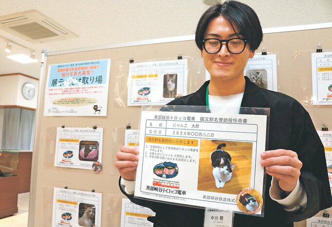 この機会に猫又駅を広く知ってもらいたいと、名誉助役の企画を考案した。一般の人が飼っている猫の写真をメールで送って“推薦”してもらい、同社が写真入りの任命書と、缶バッジを製作。宇奈月駅に展示して、飼い主がトロッコ電車に乗りに来た際に渡す。参加は無料。