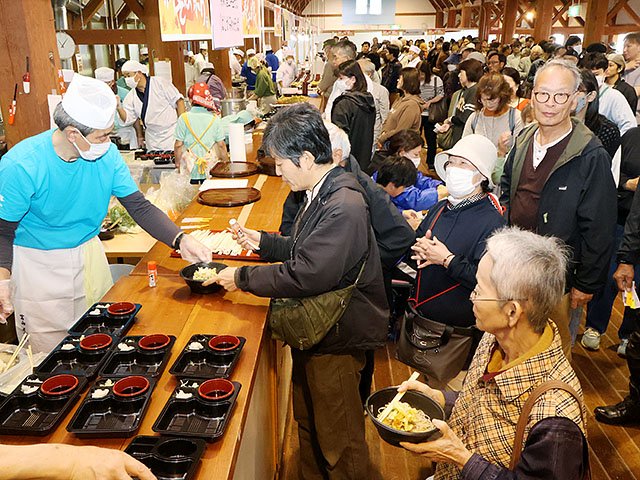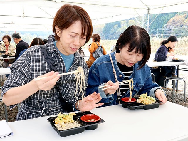 打ちたてを求める人で長い列ができ、青森県産の「階上(はしがみ)早生(わせ)そば」を味わった富山市婦中町羽根の浦野紀子さん(51)は「香り、こしがとてもいい」と笑顔を見せた。初日は2600食を販売した。