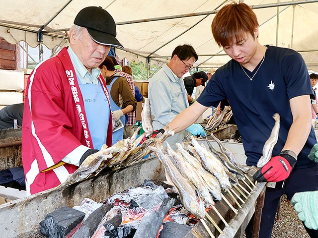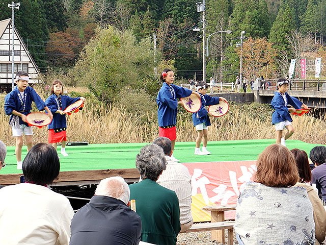 利賀産のイワナの塩焼きや五平餅、アユの唐揚げなど地元の味覚も販売。地元児童や利賀村むぎや節保存会による民謡の披露などもあった。