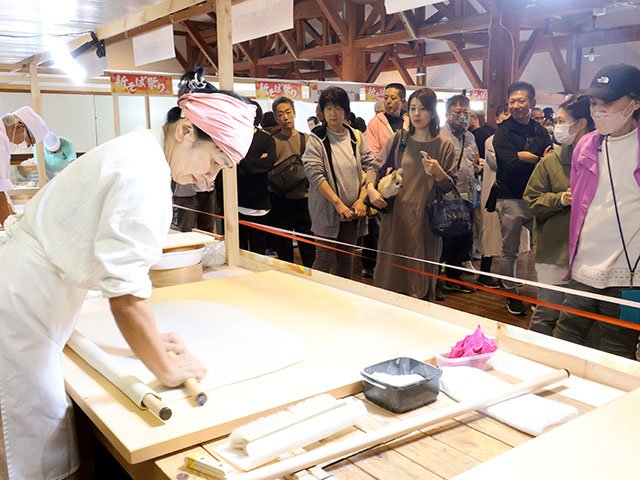 全国麺類文化地域間交流推進協議会が段位を認定している「そば打ち名人」の55人が手打ちで提供。来場者は間近で鮮やかな手つきを楽しんだ。