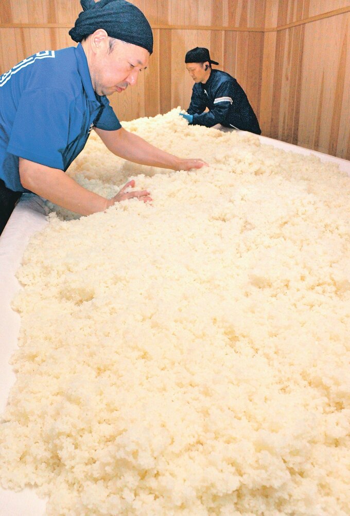 杜氏の坂本克己さんら4人が作業した。甑(こしき)と呼ばれる大型せいろで蒸した酒米120キロに、こうじ菌を振りかけ、床(とこ)に広げてもみ混ぜた。布をかぶせ、温度調節をしながら46時間ほど寝かせると米こうじが出来上がる。