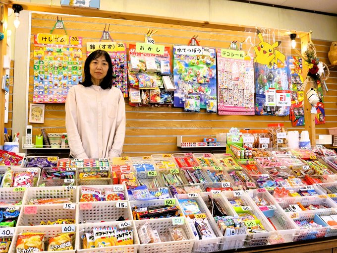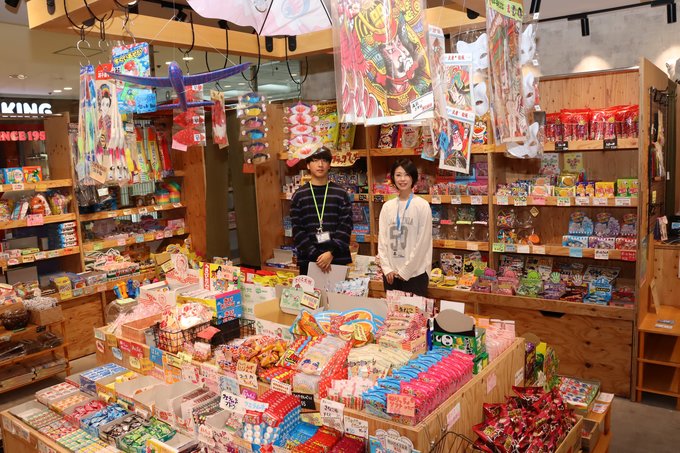 富山駅前のマリエとやま1階に2024年3月にオープンした。駄菓子だけでなく、木製の輪ゴム鉄砲やお手玉、こまなど祖父母世代が懐かしいと感じるような、おもちゃも多くそろえている。お土産を求めるインバウンドの観光客も多い。