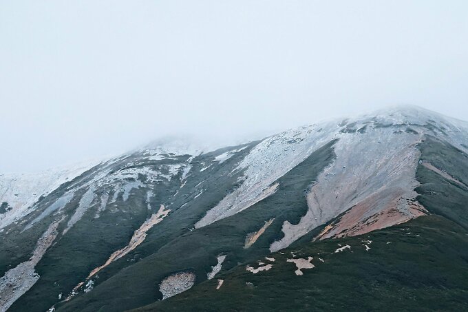 立山・雄山(標高3003メートル)の山頂周辺で5日、雪が降り積もった。