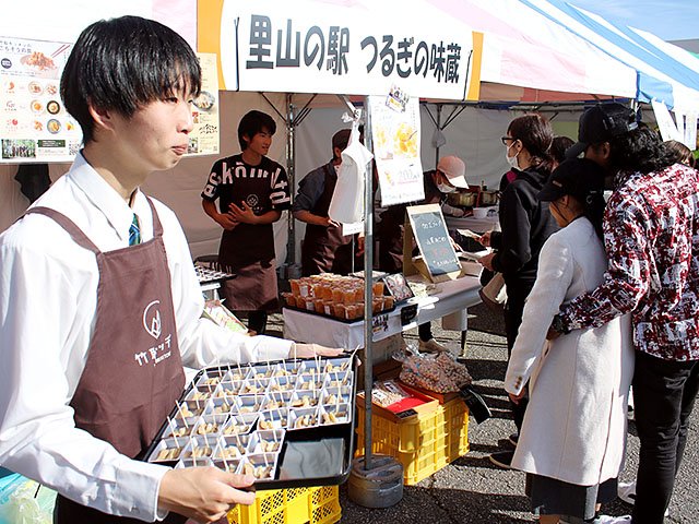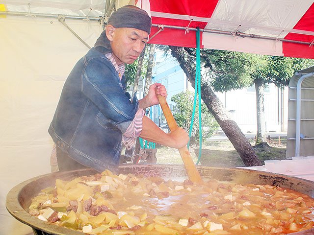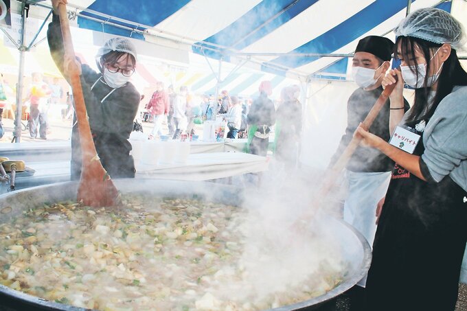 会場には飲食や体験など40以上のブースが勢ぞろい。特産のサトイモと町産の牛肉をぜいたくに使った「KAMI鍋」や名物のクマ鍋が人気を集めた。町産メンマやブランド牛の弁当、サトイモなども販売。かみいち総合病院は健康をテーマにブースを初めて開設した。