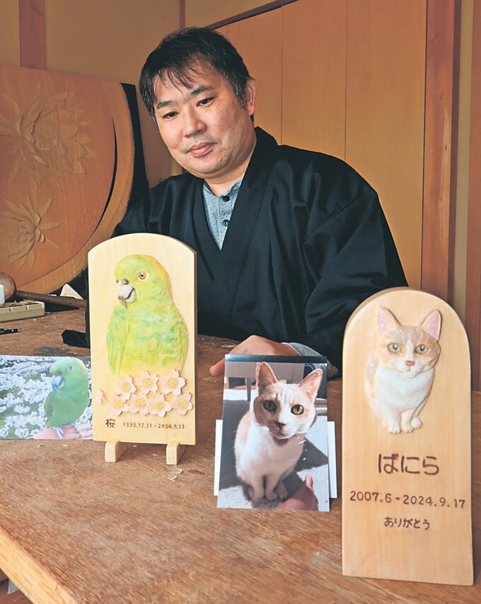富山県南砺市岩屋(井波)の木彫工芸家、木村正和さん(49)が、亡くなったペットをしのぶ木彫りの位牌(いはい)の受注を始めた。井波彫刻の技術を生かし、生前の姿を精巧に表現しつつ、木のぬくもりを感じられる仕上がりとなっており、オーダーメードで受け付ける。