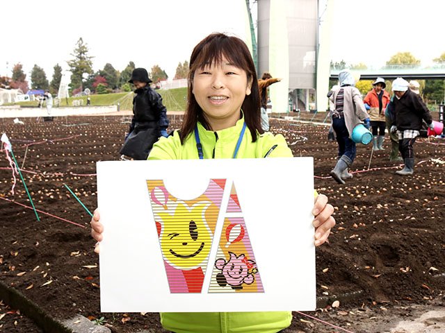 来年のフェアは4月22日~5月5日に開催。大花壇は2600平方メートルで、ウインクするチューリ君や2機の気球などの地上絵を県産品種「黄小町」やピンクの「フィノラ」などで浮かび上がらせる。会期を通して大花壇や円形花壇などを楽しめるよう、開花時期の異なる同じ色の品種を混ぜながら植える。