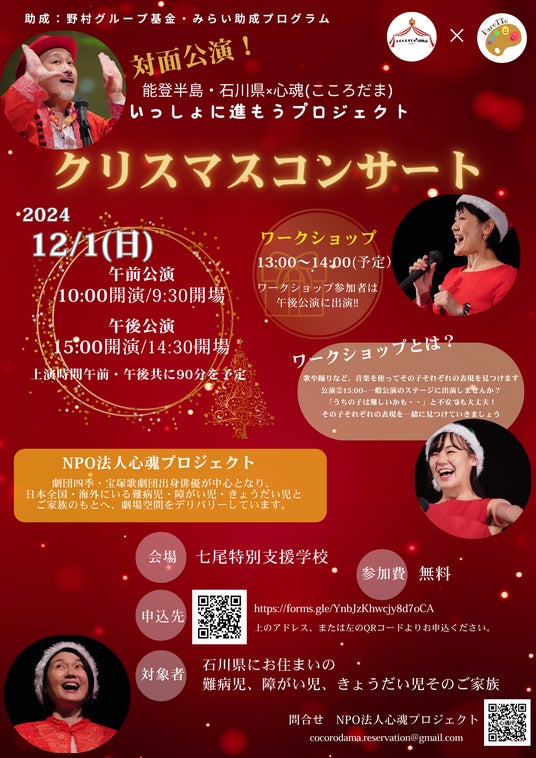 ほんのひと時でも心あたたまる非日常の空間を味わって欲しい、心へのエネルギー補給をして欲しいと願い、石川県七尾市にて難病児、障がい児、きょうだい児そのご家族にむけたクリスマスコンサートを開催します。劇団四季や宝塚歌劇団出身俳優らがつくり出す「劇場空間」をどうぞお楽しみください。
