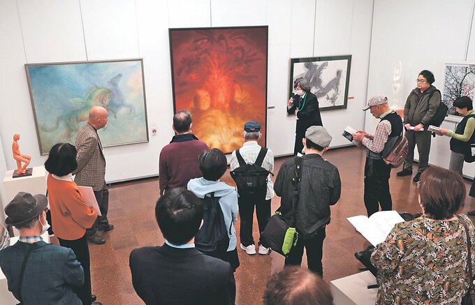 坂田さんは優秀賞に選ばれた中山友莉菜さん(富山市)の日本画「勇壮」を解説した。縦2・1メートル、横1・7メートルの大画面にソテツの木々を描いた作品で「印象に残る大きな絵でありながら、細部までよく描かれている。これからが楽しみな作家」と評価した。