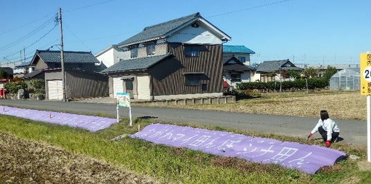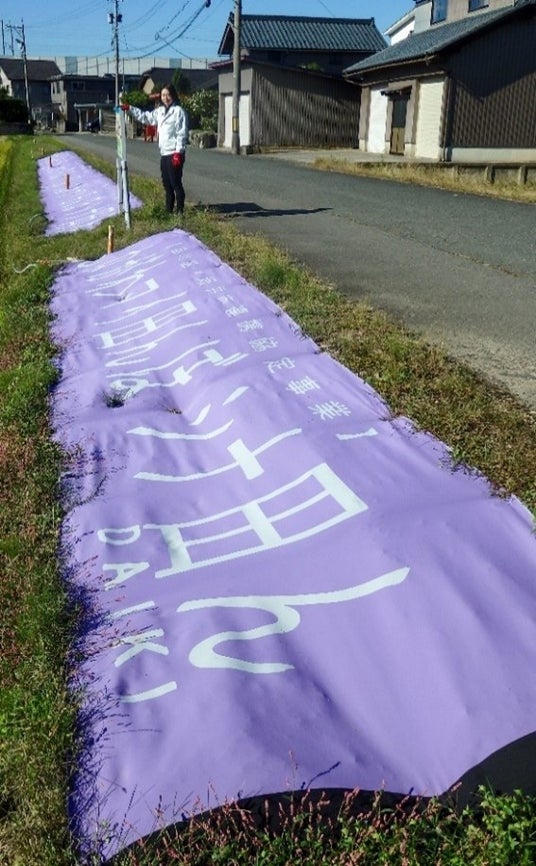 もともと水田に看板はあったものの、10月に設置した防草シートは横35メートル、縦1.7メートルと横断幕並みの大きさ。紫地の繊維に白文字がくっきり浮かび上がり、近くを通る北陸新幹線の車窓からも見えるという。市農業振興課の担当者も「水田ののり面に大きな看板が付いた感じ。市民にもこのマイ田んぼでの品川区との交流をもっと知ってもらいたい」と話している。