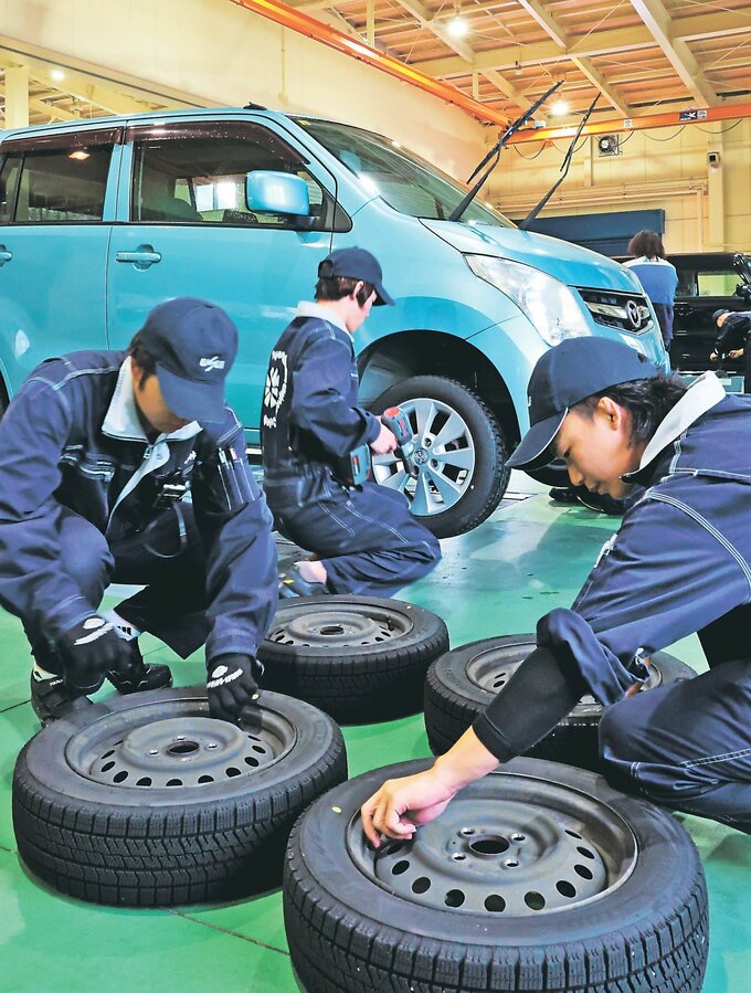 雪シーズンを控え、富山自動車整備専門学校(富山市野々上)の学生が23日、周辺住民を対象に冬用タイヤの無料交換を行った。