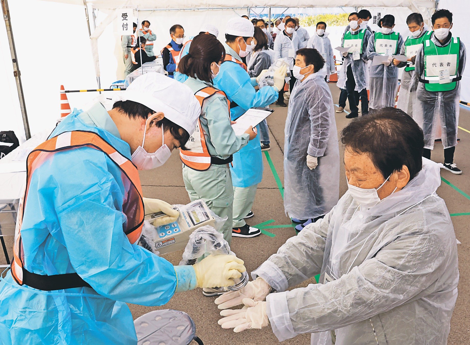 第1避難先の県西部5市での受け入れが困難な場合を想定し、県東部への広域避難訓練も初めて実施した。両地区の住民50人がバスで富山市へ移動し、避難所を開設する手順を確かめた。