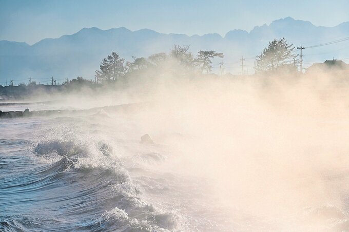 気嵐は、海面から上る水蒸気が冷気によって煙のように見える現象。四方漁港西側の同市打出では海岸から沖合にかけて現れ、波が打ち寄せるたびに気嵐が高く立ち上り、朝日を受けて黄金色に輝いていた。