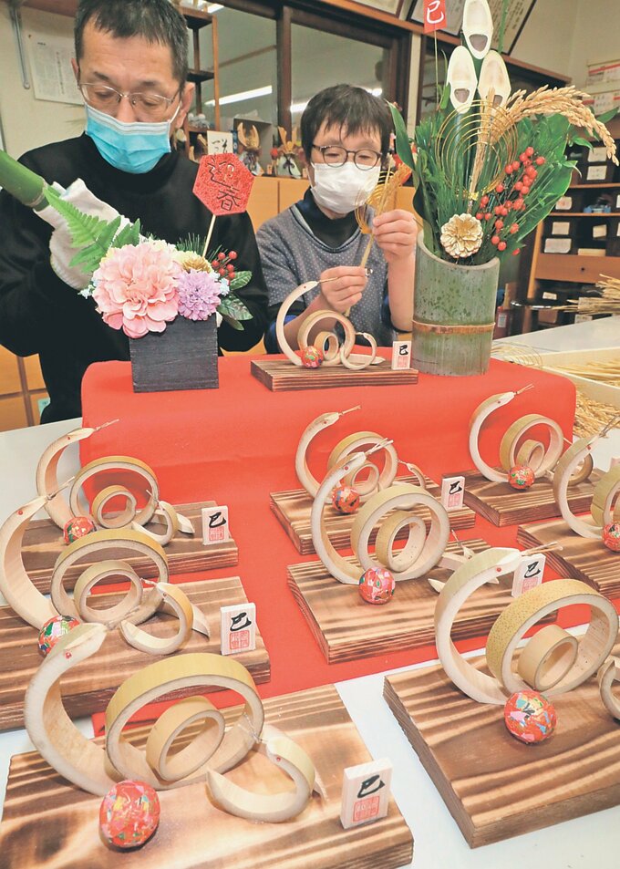 富山県氷見市阿尾の障害者就労継続支援施設の安靖(やすらぎ)氷見共同作業所で、恒例になっている来年のえとの置物やミニ門松作りが続いている。26日も利用者や職員が能登半島地震からの復興に向け、良い年になるよう願いながら地元の竹を使って仕上げた。