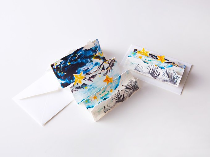 富山市のイラストレーター、古屋知世さんが手掛けたグリーティングカード「みくりが池スター」。星空が広がる冬のみくりが池を描いたじゃばら折りのカードで、裏面にメッセージを書いて送ることができる。風景の奥行きを表現した立体的な形状になっており、好きなところに置いて飾れるのも魅力だ。