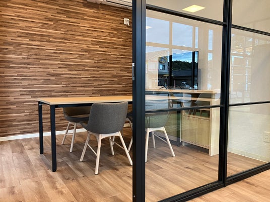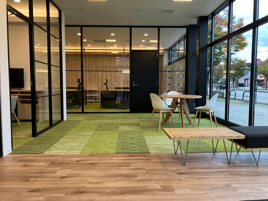 落ち着いた雰囲気の商談スペース落ち着いたグリーンと木目調のインテリアで、リラックスしながら商談を行える空間になっています。静かで集中しやすい環境を整え、お客様とのコミュニケーションが円滑に進むよう配慮されています。